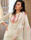 The three-quarter sleeves and hem are beautifully embellished with exquisite embroidery, showcasing fine craftsmanship. The kurta is paired with matching Purple pants, featuring embroidered borders that complement the kurta’s design, ensuring a cohesive and stylish look.