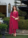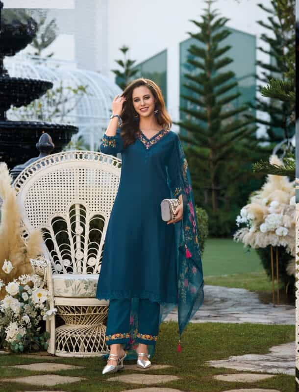 The three-quarter sleeves and hem are embellished with delicate embroidery, seamlessly blending traditional artistry with modern style. The kurta is paired with matching blue pants, accentuated with embroidered borders that mirror the kurta’s design, ensuring a cohesive and stylish look.